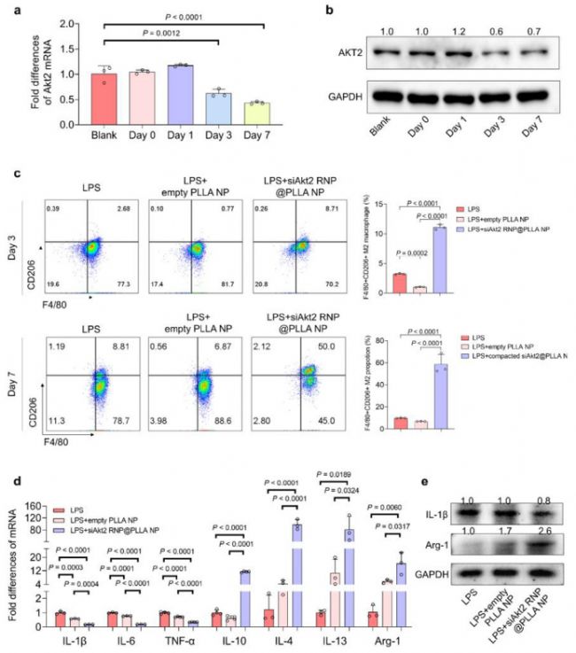 图 4 原文 Figure 3:a) Akt2 基因沉默效率;b) AKT2 蛋白表达变化;c) F4/80+CD206+ M2 细胞比例;d-e) 炎症因子表达调控