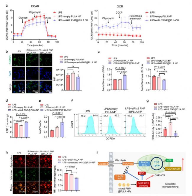 图 5 原文 Figure 4:a) 胞外酸化率(糖酵解)与耗氧率(OXPHOS);f) ROS 生成抑制;h) 线粒体膜电位修复;i) 代谢重编程机制示意图