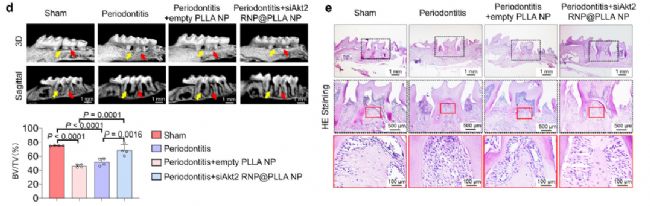图 6 原文 Figure 5:d) 微 CT 3D 重建与骨体积分析;e) HE 染色显示骨组织再生与牙周膜形成