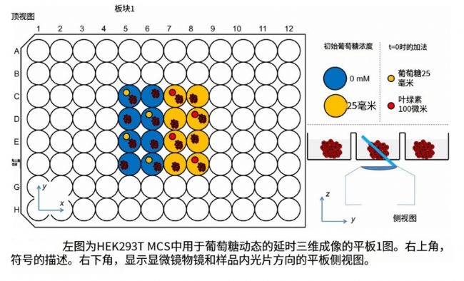 证明了在市售玻璃底96孔板中表达FRET生物传感器的MC中探测3D时空动态的潜我们使用表达细胞间葡萄糖双功能的细胞,使用细胞测量法进力。行测量。亚细胞分辨率成像获得成像深度~100um的球体。我们以10分钟的间隔对16口井成像4小时,生成530GB的原始图像数据(板1)。在制备和成像于不同日期的板上重复该实验,说明了该方法的可重复性(板2)。我们展示了SSOPM 在96个孔板中进行葡萄糖剂量-反应三维测需要9分钟的图像采集(板3)。量的潜力,使用42个孔板。