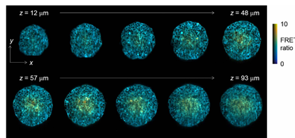 我们的 3D 成像方法显示,在葡萄糖存在下培养的球体中心的 FRET比值增加。这可能是由于球体内葡萄糖或 pH的梯度,需要进一步实验和/或使用改进的牛物传感器来进一步调查。此外,我们使用 SSOPM 记录了葡萄糖缺乏的 HEK293T球体暴露于葡萄糖时的时空 FRET比值响应。使用获得的 3D 图像数据,我们计算出 FRET比值作为图像点与球体表面最小距离随时间的变化函数。在未来,SSOPM可能会发现更多应用于研究各种各样的FRET生物传感器。