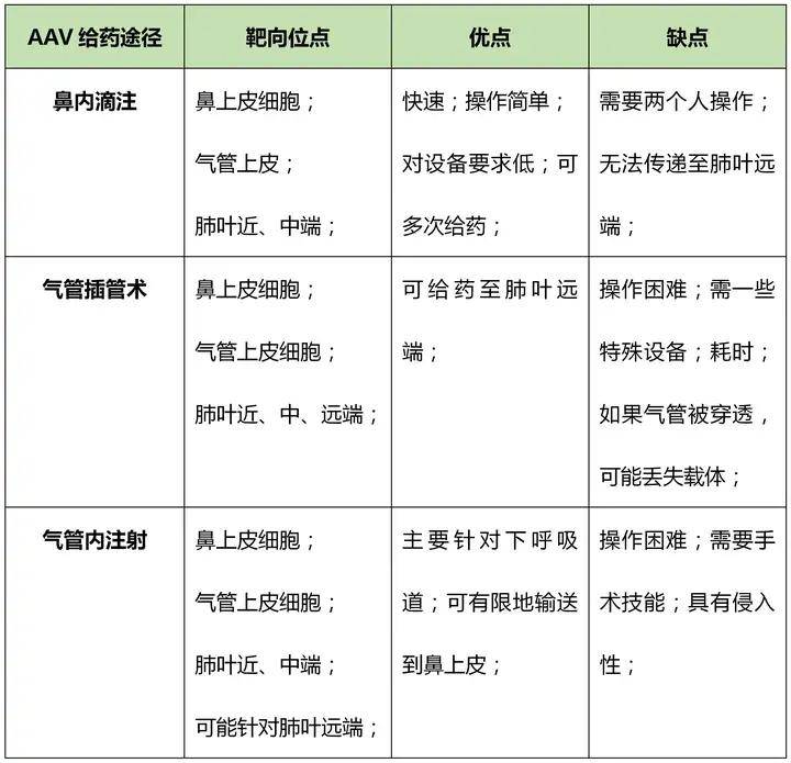 口腔气管插管术能够将病毒载体直接灌输入肺中,却没有外科手术的风险,并且避免了上呼吸道的病毒颗粒的损失。由于几乎所有AAV病毒颗粒都会到达肺内,所以要严格控制AAV的使用量。同时,与鼻内滴注法相比,口腔气管插管术需要一些特殊设备,操作起来也稍有难度。