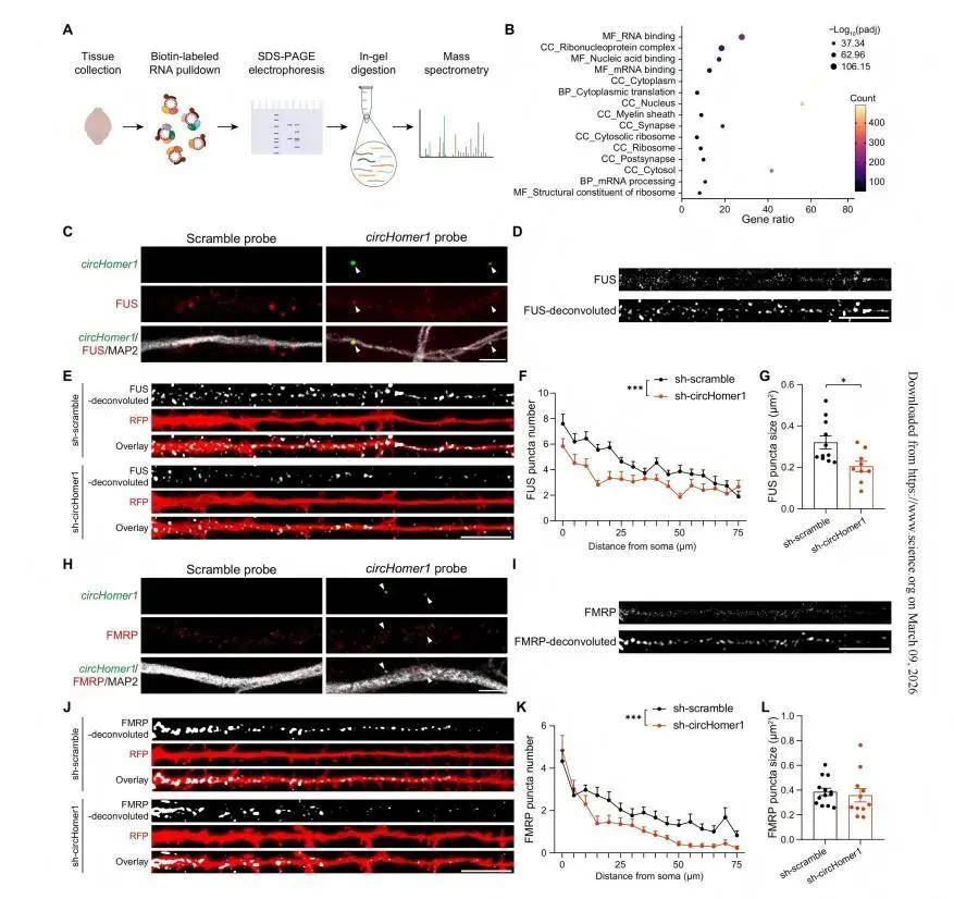 环状RNA是通过反向剪接形成的闭环RNA,此前曾被认为是转录过程中产生的无功能的非编码副产物。然而,越来越多的证据表明,环状RNA在大脑中具有关键功能,例如调控神经元信号传递和突触可塑性。尽管如此,环状RNA发挥功能的具体分子机制在很大程度上仍有待探索。circHomer1由Homer1基因外显子2-5经反向剪接形成,在突触富集,其在视觉皮层、眶额皮层参与突触可塑性调控,但在海马体(空间学习记忆核心脑区)的功能及机制未知。2026年2月11日,香港中文大学叶柏勤团队在Science Advances(IF12.5)上在线发表了题为“Circular RNA circHomer1 mediates hippocampal functions via ribonucleoprotein granule transport and dendritic targeting of synaptic RNAs”的研究论文。文章揭示了circHomer1通过作为分子桥连接运动蛋白KIF5与神经元核糖核蛋白颗粒核心组分FUS、FMRP,介导突触mRNA的树突靶向运输与定位,调控树突棘形态、突触功能及小鼠海马体依赖性空间学习和记忆的分子机制。