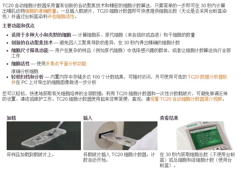 另外,之前用于TC10的耗材与外围设备与TC20兼容,产品名称与货号也与原来保持一致:Counting kit (包含slides与trypan blue),Counting slides,Trypan blue dye, Thermal label printer & labels和Verification kit。