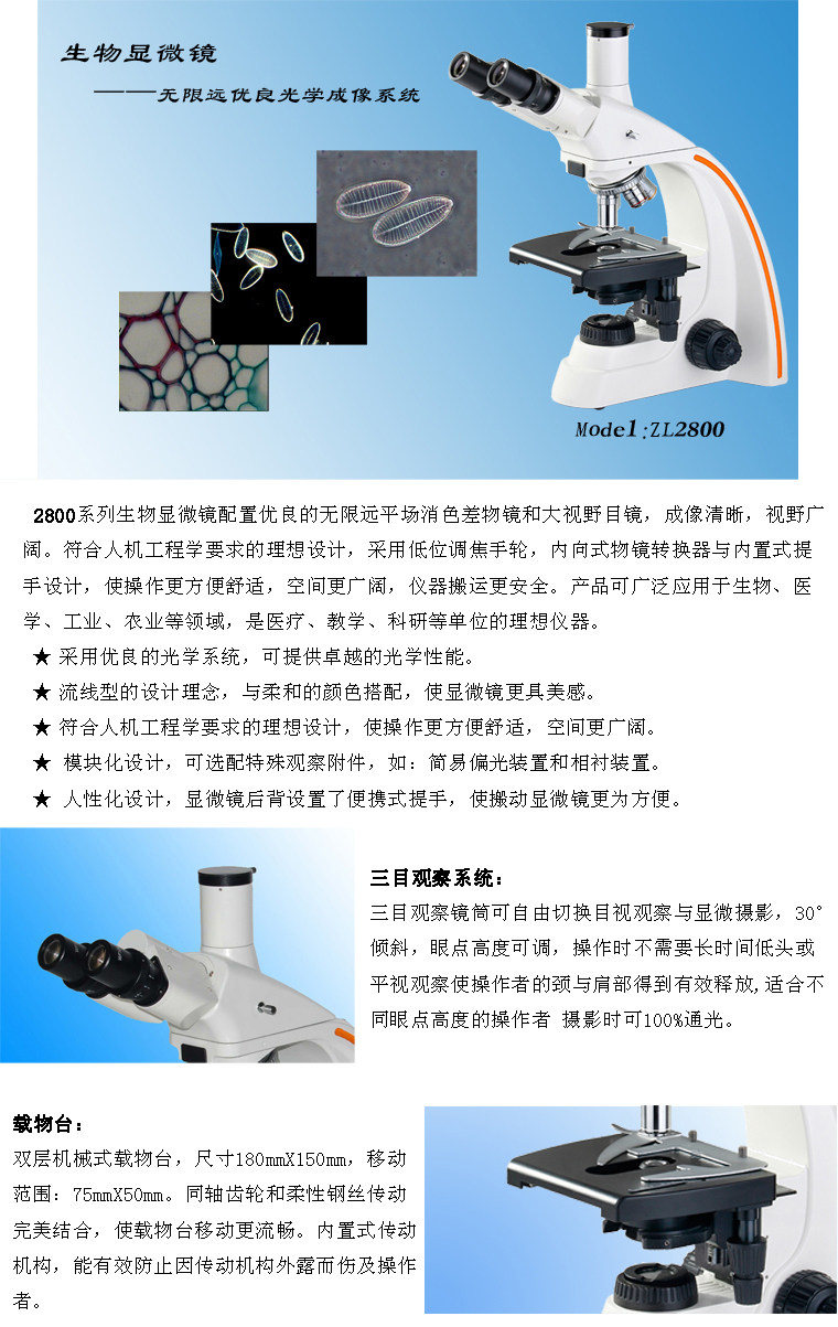 ZL2800系列生物显微镜配置优良的无限远平场消色差物镜和大视野目镜,成像清晰,视野广阔。符合人机工程学要求的理想设计,采用低位调焦手轮,内向式物镜转换器与内置式提手设计,使操作更方便舒适,空间更广阔,仪器搬运更安全。产品可广泛应用于生物、医学、工业、农业等领域,是医疗、教学、科研等单位的理想仪器。