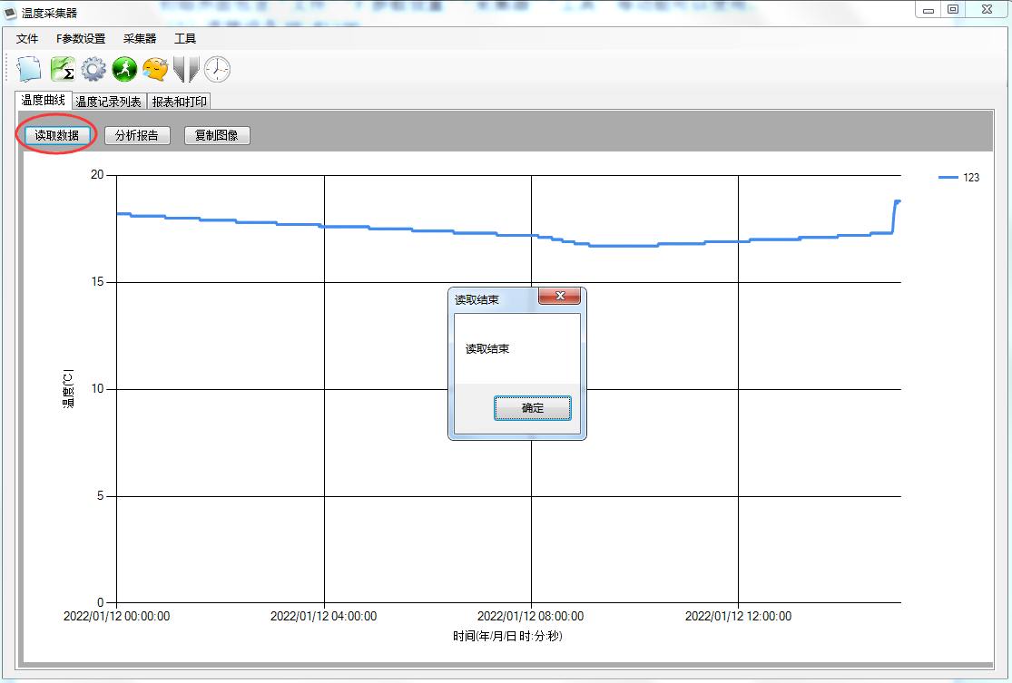 按下读取数据,则可以把设备HK-W1100上的数据上传到电脑端,如图所示,表示读取数据成功。