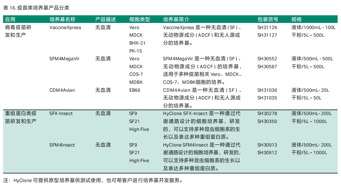 目前 GE,whatman, HyClone 可以以干粉或者液体形式提供包括 DMEM、DMEM/F12、M199、MEM、RPMI 1640等数十种经典培养基,并可以根据客户的需求提供定制服务。