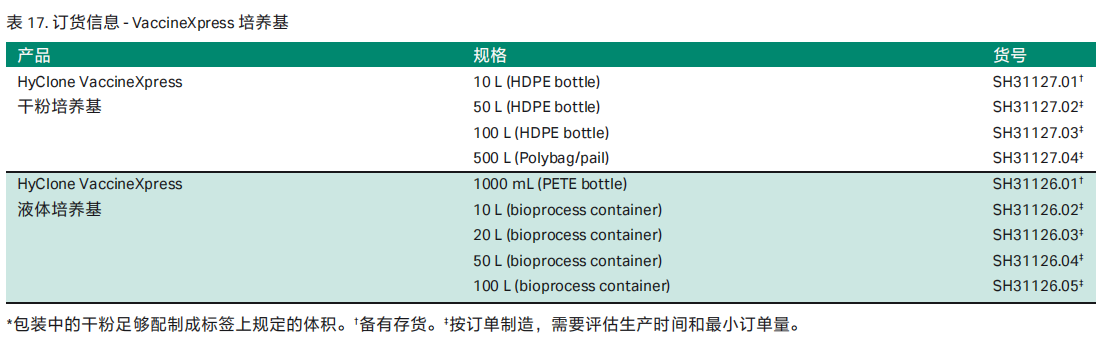 Cytiva 研发的VaccineXpress 培养基可以提供最大批量10,000L 的液体培养基,也可以提供最大批量为250,000L的干粉培养基。