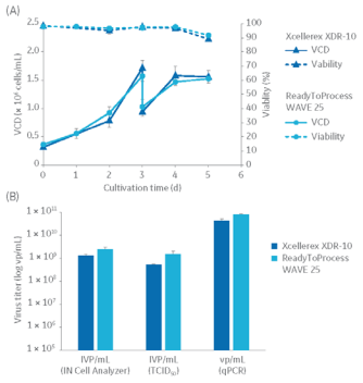图10.分别在WAVE25和XDR10反应器中采用CDM4HEK293 培养基进行10L 体积的 HEK293 细胞培养∶