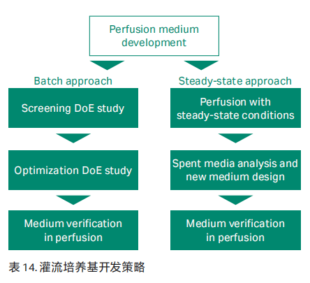 CHO细胞培养灌流过程被认为是一个真正集成的连续性生物制造管线的最佳选择,而一款营养丰富且均衡的灌流培养基就显得十分重要,它不仅要支持较低的单个细胞灌流速率(CSPR)以此来最小化培养基的消耗,从而减少设备费用、实验场地以及产品的稀释;另外也要最大化活细胞维持的时间和蛋白产率。HyClone 有一系列原型灌流培养基,详情可以联系技术支持。此外,可以参照如下方式进行灌流培养基的开发,更详细情况可参考灌流培养基开发资料。