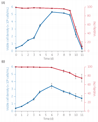 图9.HEK293细胞在摇瓶中培养的密度和活率∶(A)CDM4HEK293培养基;(B)对照培养基