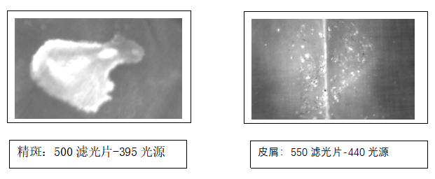 安装500nm接收滤光片,用395nm光源照射检材;安装550nm接收滤光片,用440nm光源照射检材。可以观察拍照