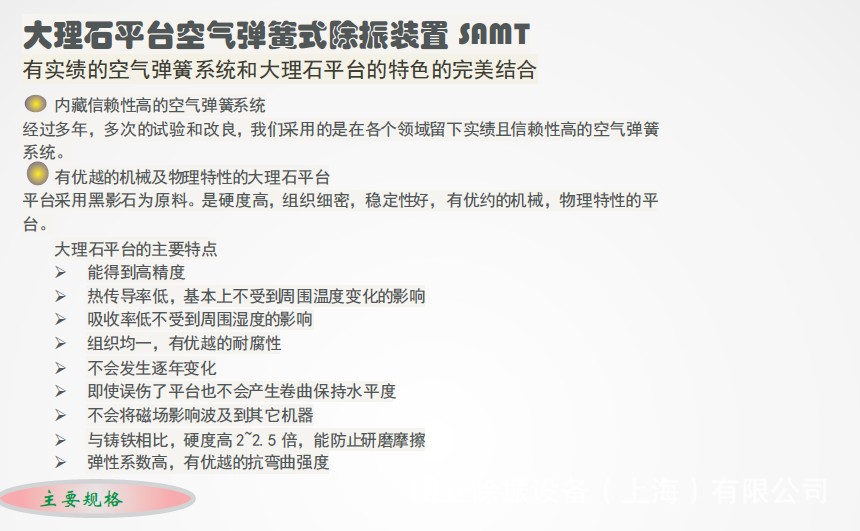 明立除振设备(上海)有限公司(http://)/(http://www.meiritz.cn)是由日本明立精机株式会社投资成立的专业生产隔振平台,隔振台,隔震平台,防震台,光学平台,光学防抖,光学变焦平台,防振台,除振平台,光学桌,面包板,消振台的工厂。公司的技术全部来源于日本,居于世界领先水平。产品的关键部件一律从日本进口。这种模式让明立在产品质量上远胜同类厂家,在产品价格上又远低于进口产品。公司采用日本的管理方式,对于产品质量控制的十分严格。产品包装一律采用全新加固木箱,非常适合长途运输。和大型物流公司德邦深度合作,确保每一件产品能够安全又及时的送达。明立期待与您的合作!明立除振设备(上海)有限公司致力于提供符合各类平台使用的除振平台,光学变焦平台,光学防抖平台,产品技术来源于母公司明立精机株式会社,关键部件包括传感器,空气气囊,蜂窝板等等也是由明立精机株式会社直接提供。使得明立可以用国产的价格提供进口的质量。产品部员工每月都参加为期一周的日本方面主持的产品技术培训,确保中方员工的技术实力保持在行业领先水平,明立有信心能够给你带来符合您需要的产品!如有任何需要,请联系我们!MEIRITZ----隔振行业知名品牌!