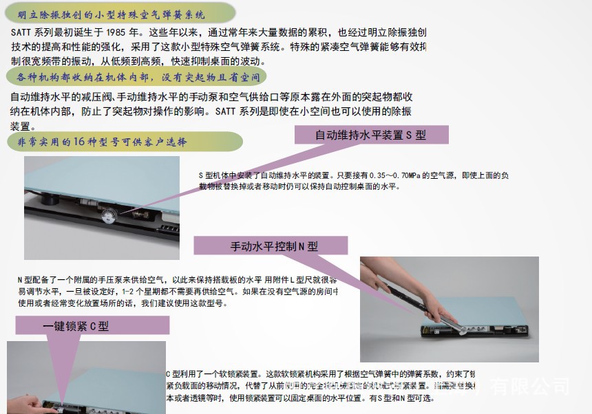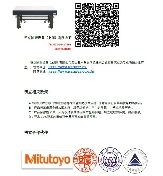 明立除振设备(上海)有限公司致力于提供符合各类平台使用的除振平台,光学变焦平台,光学防抖平台,产品技术来源于母公司明立精机株式会社,关键部件包括传感器,空气气囊,蜂窝板等等也是由明立精机株式会社直接提供。使得明立可以用国产的价格提供进口的质量。产品部员工每月都参加为期一周的日本方面主持的产品技术培训,确保中方员工的技术实力保持在行业领先水平,明立有信心能够给你带来符合您需要的产品!如有任何需要,请联系我们!MEIRITZ----隔振行业知名品牌!