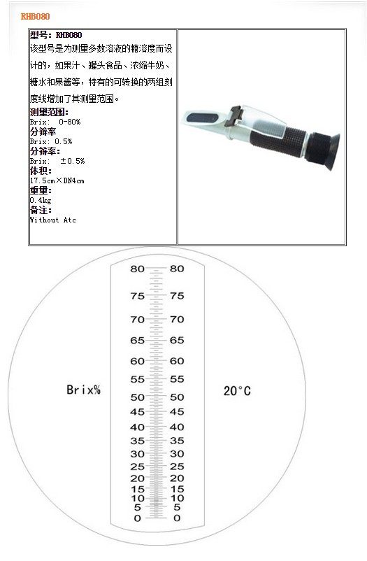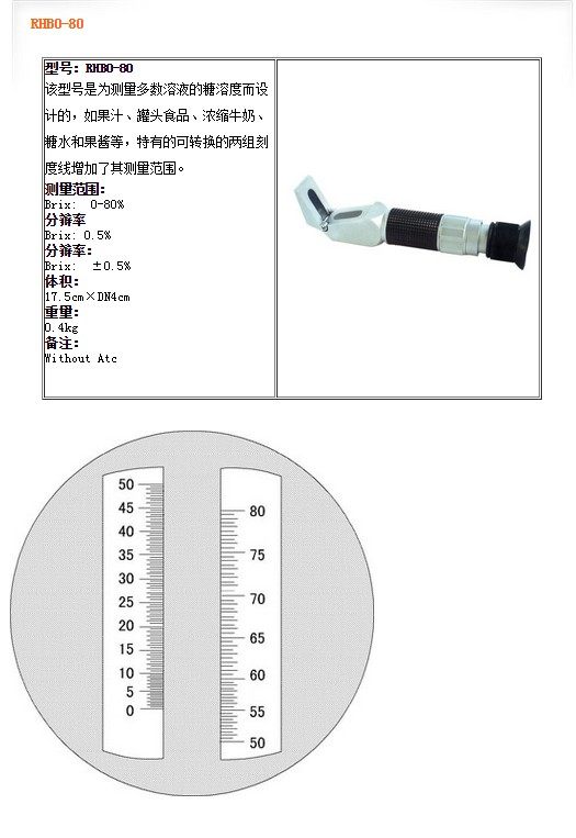 | RHB0-80 | Brix: 0-80% | Brix: 0.5% | Brix: ±0.5% | Without Atc |