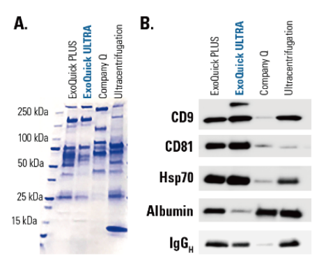 A. 用不同的方法提取外泌体,提取的外泌体蛋白胶经考马斯亮蓝染色检测外泌体 蛋白含量,结果表明ExoQuick Ultra中仅含有一些特定的蛋白。Western Blotting结 果显示,ExoQuick Ultra提取的外泌体中特异性marker CD9和CD81,Hsp70含量更高,而杂蛋白Albumin和IgGH含量最低。