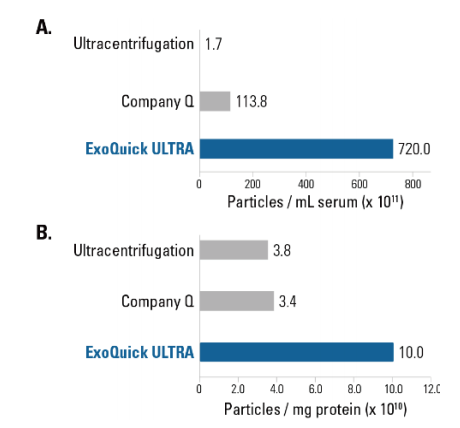 A. 与用竞品Q和超离方法提取的外泌体相比,每毫升血清中用ExoQuick Ultra提取 得到的外泌体颗粒数更多。与用竞品Q和超离方法提取的外泌体相比,通过fNTA 检测在提取的每毫克蛋白中,外泌体的颗粒数更多。