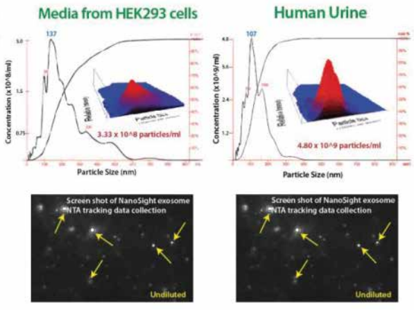 使用2mlExoQuick-TC试剂提取10mlHEK293细胞上清液,提取3.33X108particles/ml。 使用2.5mlExoQuick-TC试剂提取5ml正常人的尿液,提取4.8X109 particles/ml。