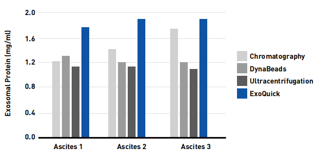 使用 4 种方法从卵巢癌腹水样本中提取 exosome。以 BSA 为标准品,使用 Bradford microassay 法测exosome 蛋白总量。结果显示,使用 ExoQuick 提取获得 exosome 量较高。