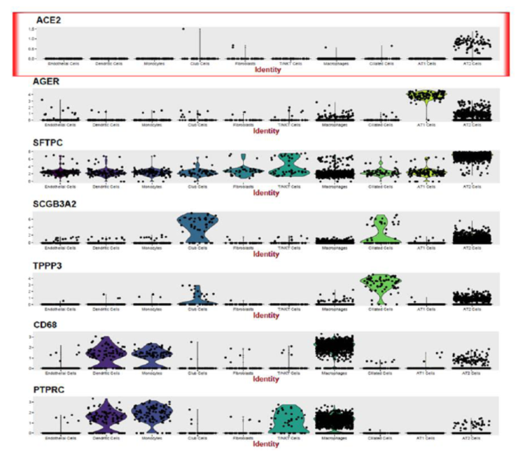 图 单细胞 RNA 测序应用:ACE2 和其它 marker 基因在细胞亚群中的表达 [12]