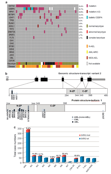 AEL 中的突变【a】58 个 AEL 病人的突变分布图;【b】GATA2 蛋白的结构;【c】GATA2 突变在 AML, CML-BC, MDS 及 ALL. 中的患病率。