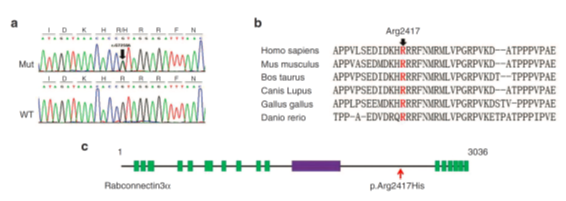 ▲图 2【a】变异和参考序列的色谱图。【b】DMXL2 的 Arg2417 残基在 Homo sapiens, Mus musculus, Bos taurus, Canis lupus, Gallus gallus 和 Danio rerio 中具有保守性。【c】DMXL2 蛋白的功能域和 p.Arg2417His 变异的位置。