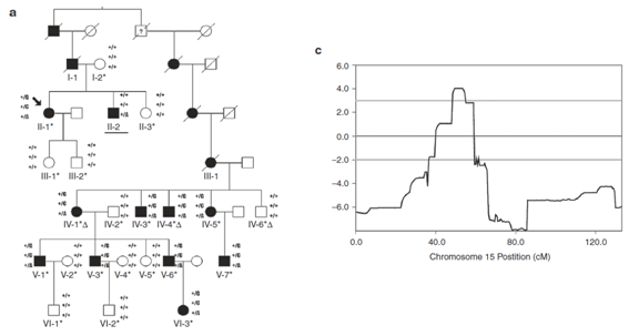 ▲图 1【a】患有常染色体显性的非综合征听力丧失家系图谱。箭头所指为先证者,星号标记的个体参与了 SNP 芯片连锁分析,三角标记个体(II-1,IV-1,IV-4,IV-6)则后续用来进行全外显子组测序,下划线标记个体 II-2,则包含了一个关键的重组事件。 【c】15 号染色体连锁分析的 LOD 值,当把 II- 2 个体包括后,其大的 LOD 值达到了 4.33。